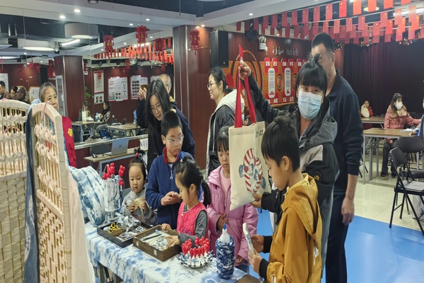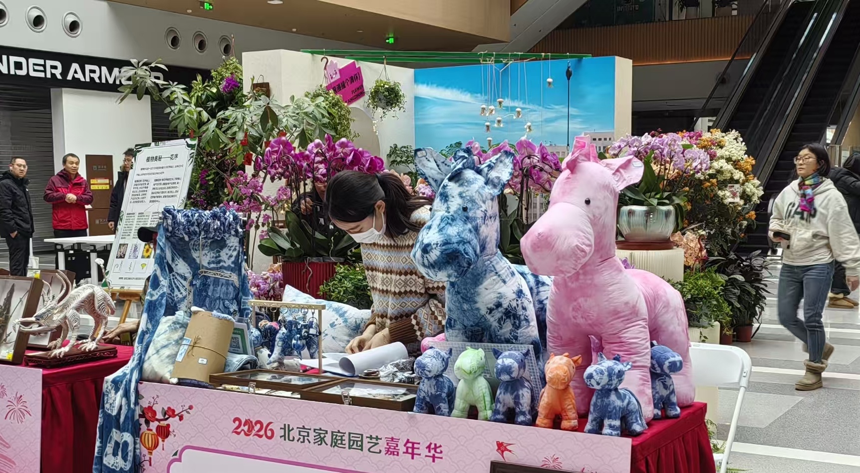 春节期间,首钢园六工汇年宵花市集热闹非凡,姹紫嫣红的年宵花旁,靛蓝色的扎染作品尽显古朴雅致,成为亲子家庭体验非遗的热门选择。孩子们在创作者的指导下,亲手体验扎染流程,家长们则驻足欣赏成品。残疾人创作者们一边细致讲解技艺要点,一边分享创作心得,让更多人感受到非遗的魅力,也让自己在互动中收获满满的快乐与成就感。