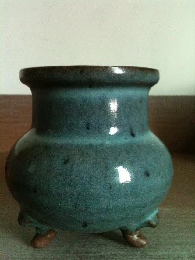 钧瓷之妙,在于入窑一色,出窑万彩。这尊三足炉承袭宋元钧窑正宗技艺,釉色纯净典雅,局部飘红,正所谓“钧瓷飘红,万世不穷”,无刻意雕琢,尽得自然天成之趣。炉型源自上古礼器,端庄肃穆,既可焚香静心, 又可陈设镇宅,是宋代文人审美与民间匠艺的完美融合,承载着宋元社会的生活气息与文化信仰。